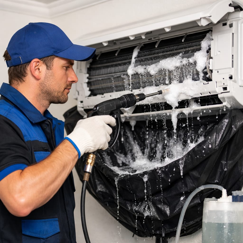 Profesyonel Bakım (Yılda 2 Kez): Bu iş uzmanlık ister. Biz Miraç Teknik olarak; ön paneli söküyor, o hassas 23.000 mikro deliği ve arkasındaki Tri-Care filtre sistemini özel buharlı ve basınçlı cihazlarla temizliyoruz.